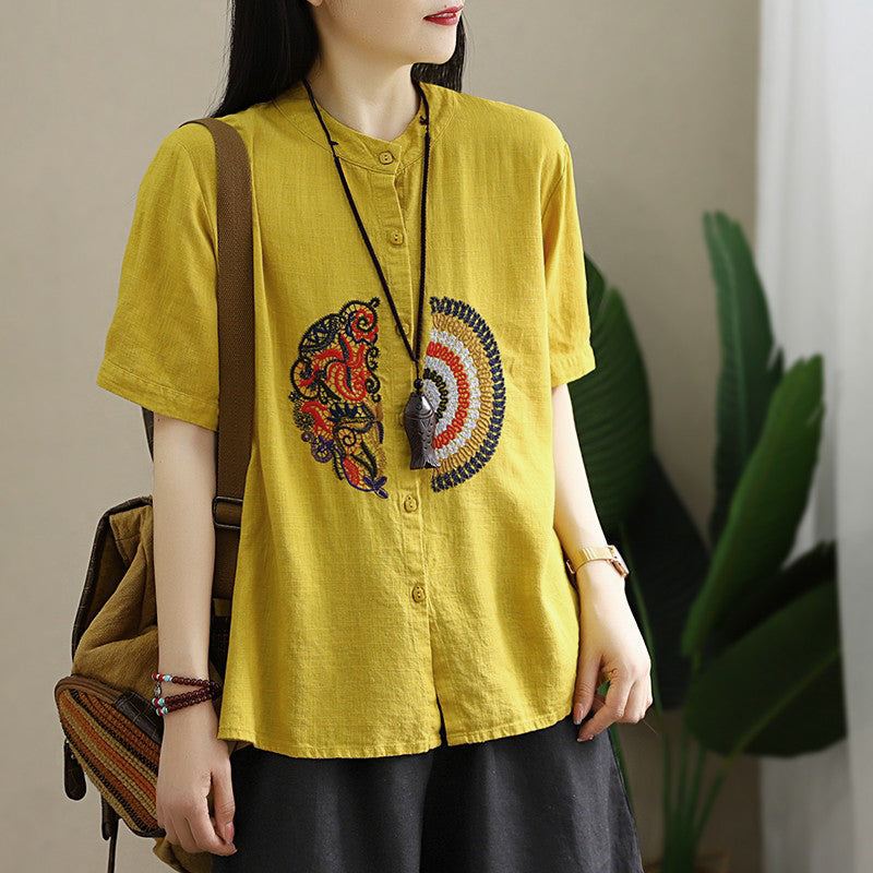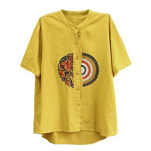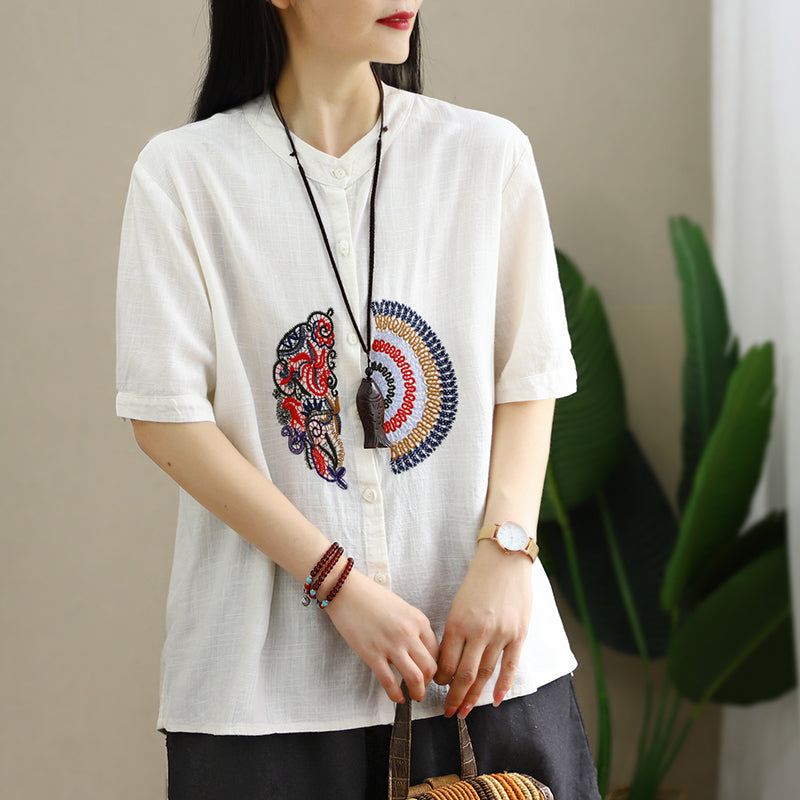 Damska Letnia Bawełniana Lniana Koszulka Z Haftem Retro