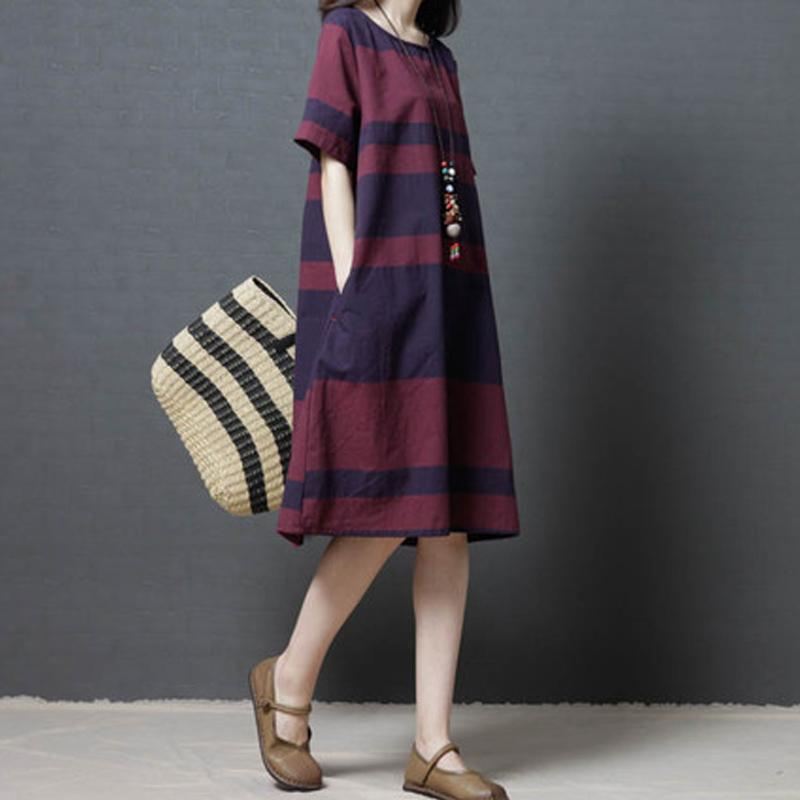 Damska Letnia Sukienka W Paski Z Krótkim Rękawem