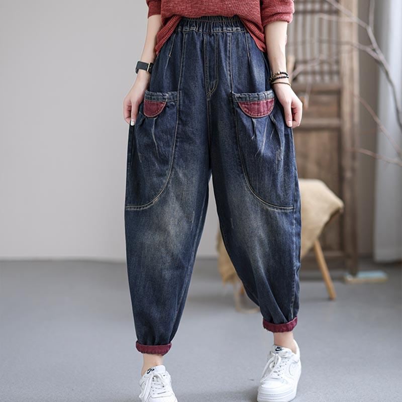 Jesień Plus Size Granatowe Retro Casual Bawełniane Spodnie Jeansowe