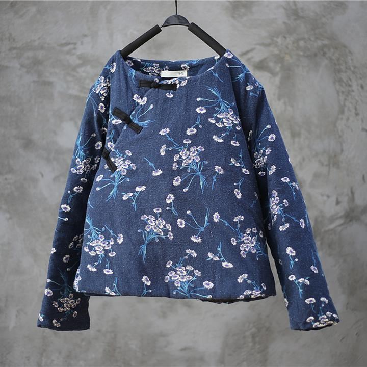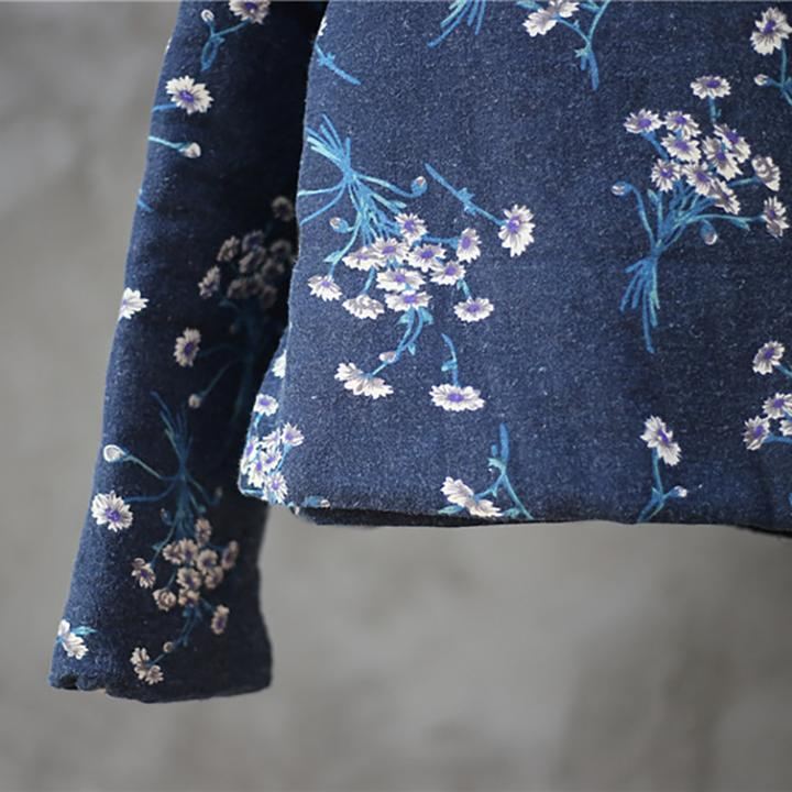 Niebieski Kwiatowy Retro Luźny Damski Płaszcz Pikowany