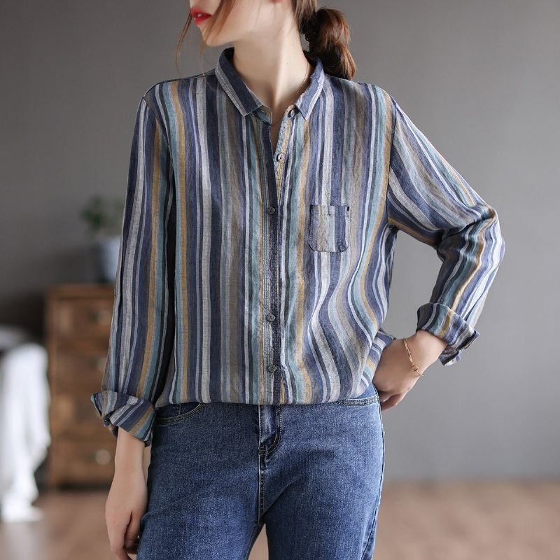 Retro Lniana Bluzka Z Długim Rękawem W Luźne Paski