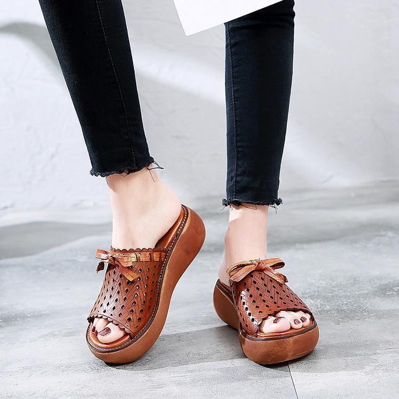 Skórzane Vintage Hollow Out Wedge Damskie Kapcie Na Co Dzień