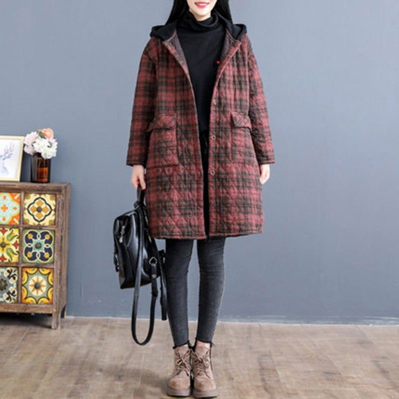Vintage Rombowy Płaszcz Zimowy Z Kapturem W Kratę